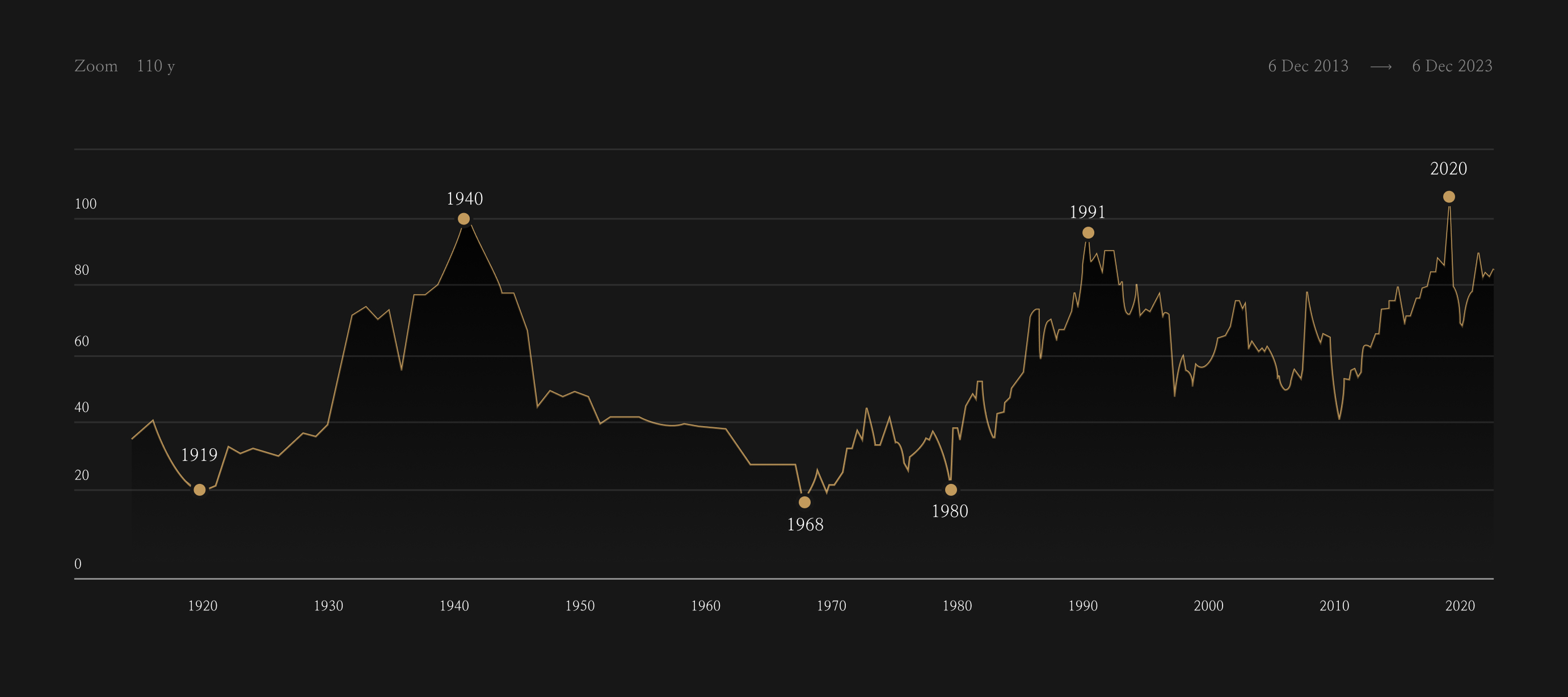 From 1792 until 1873, the dollar was on a bimetallic standard. Meaning, it was defined as both a weight of silver and a weight of gold simultaneously, at approximately a 15:1 ratio. This presented some problems, because the natural market ratio is never completely static. Supply and demand always fluctuate. That means if silver would fall in value relative to gold, Gresham’s Law would kick in and gold would disappear from circulation and vice versa. Be that as it may (we’ll solve this problem later in this article), if the ratio of 15:1 sounds familiar, it should. It is the peak ratio that markets have returned to three times in the last century. Once in 1919, once in 1968, and once in 1980. It could be called silver’s triple top relative to gold. See the 110-year silver chart below: